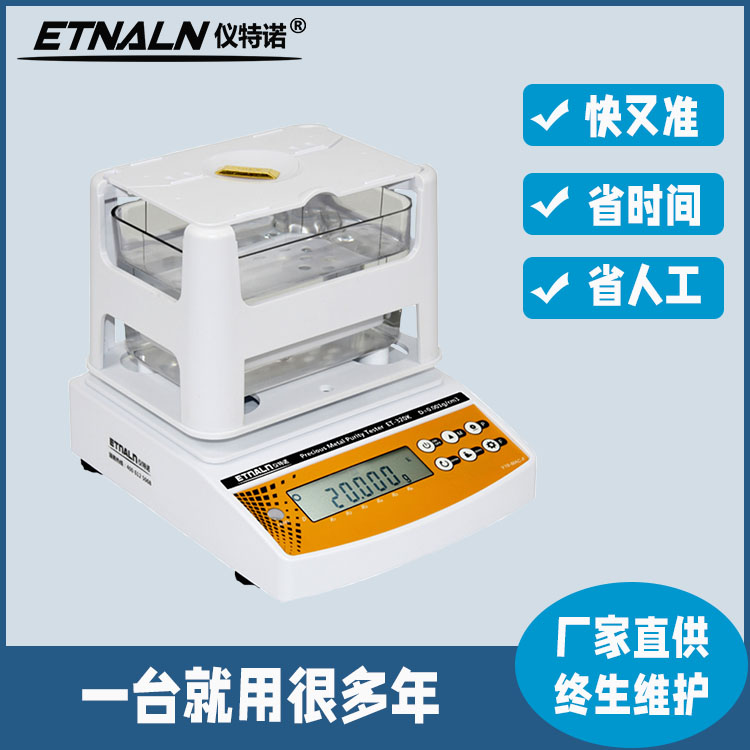 4、相對簡單易行:儀特諾黃金密度計ET-320K,ET-600K等系列測量黃金密度和純度的儀器,無需捆綁測試樣品,僅兩個步驟,即可準(zhǔn)確、快速的顯示黃金K值、%含量、密度值;鉑金PT值、%含量、密度值;銀S值、%含量、密度值;及其它合金的%含量、密度值。