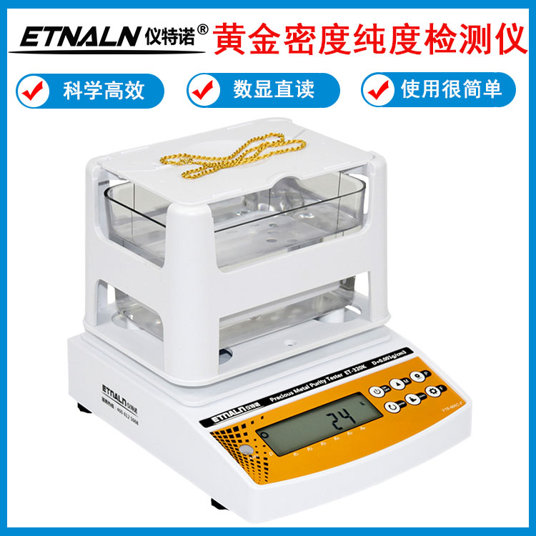 儀特諾黃金密度計(jì)_貴金屬純度檢測(cè)儀_黃金首飾檢驗(yàn)真假的儀器ET-320K、ET-600K 、ET-1200K,無需捆綁測(cè)試樣品,僅兩個(gè)步驟:先測(cè)量空氣中重量,按ENTER鍵,再放入水中測(cè)水中重量,按ENTER鍵,即可準(zhǔn)確、快速的顯示黃金K值、%含量、密度值;如果是測(cè)鉑金,即2步直接顯示鉑金PT值、%含量、密度值;或測(cè)銀就直接得出銀S值、%含量、密度值;也可以測(cè)量黃金或及其它合金的%含量、密度值。